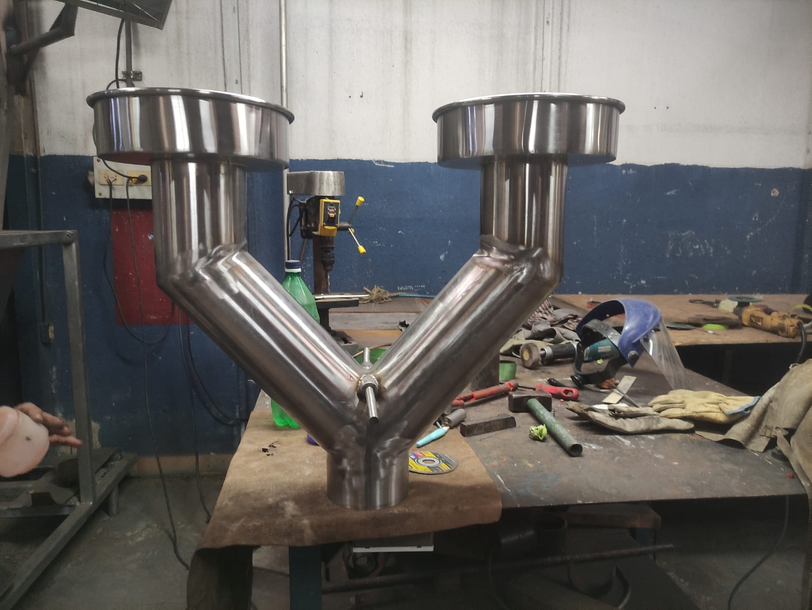 Fabricación especializada de un ducto bifurcado tipo "pantalón" en acero inoxidable, diseñado específicamente para la descarga y distribución de polvo de cacao. Este componente crítico conecta las tolvas de almacenamiento con las líneas de envasado, priorizando un diseño sanitario que elimina puntos muertos donde podría acumularse el producto y generar contaminación cruzada.