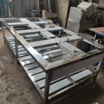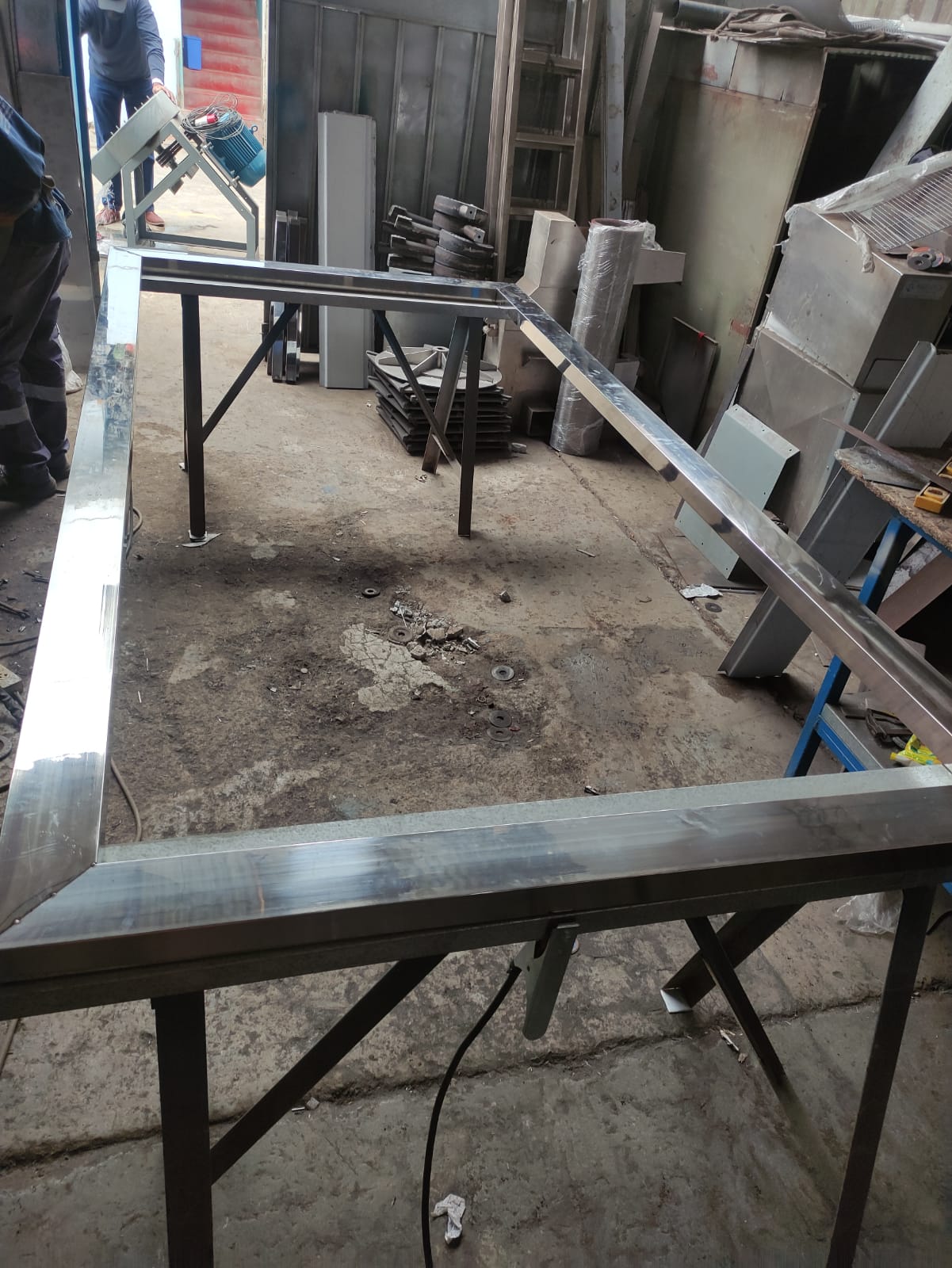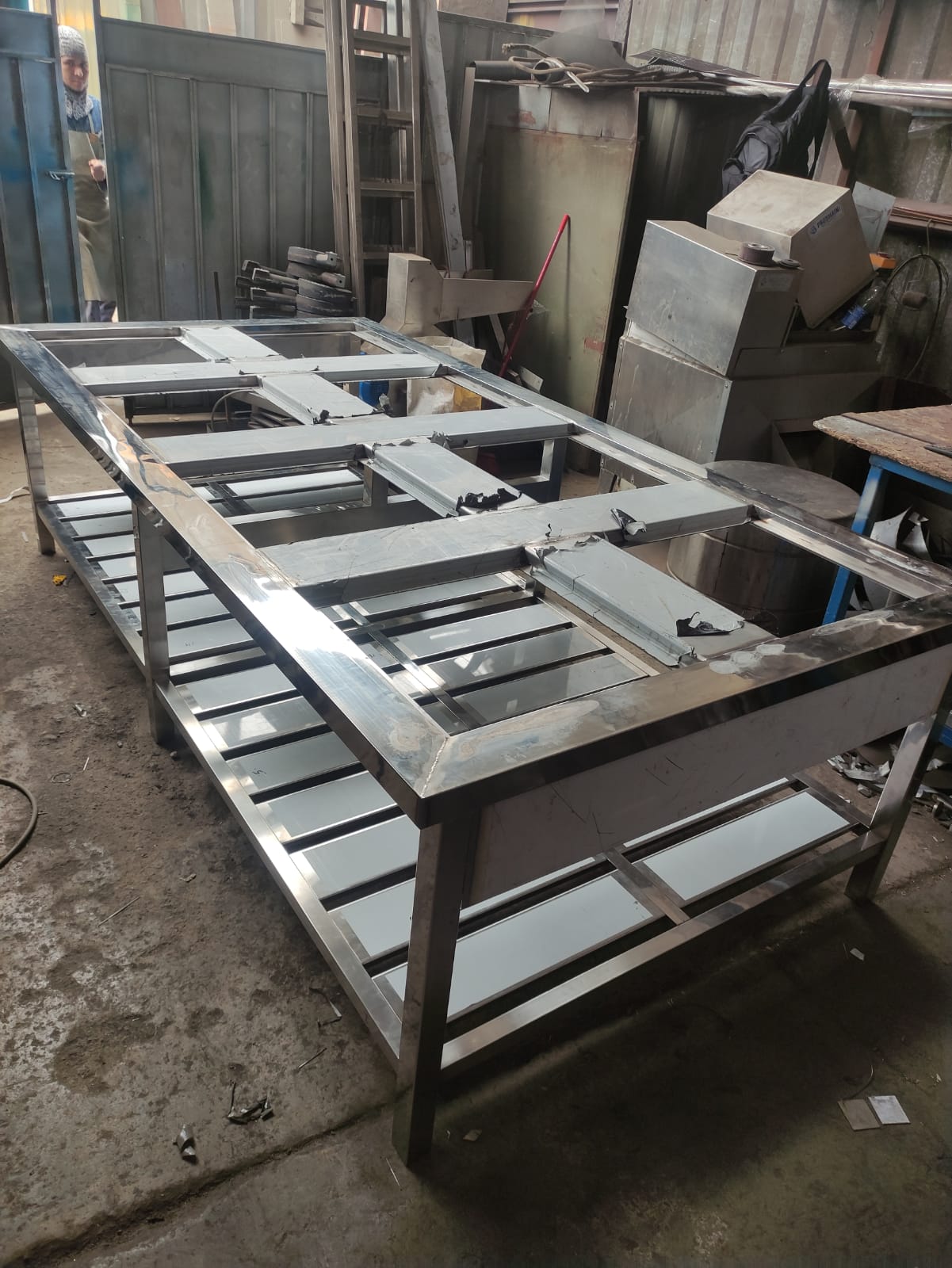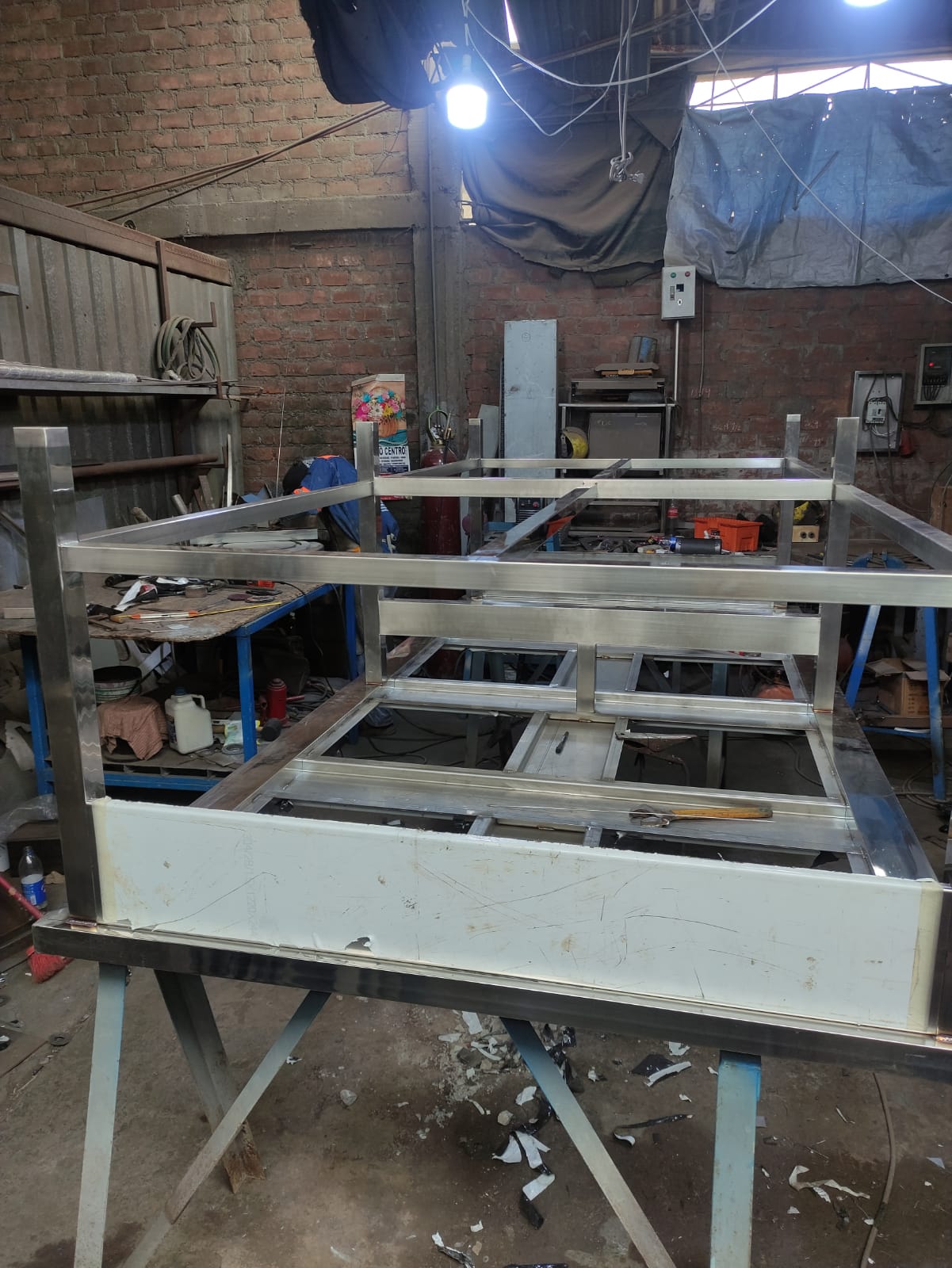 El proceso de fabricación incluyó el corte láser de láminas y la soldadura mediante proceso GTAW (TIG), garantizando juntas lisas y redondeadas que evitan la acumulación de bacterias. Se diseñaron y construyeron mesas de trabajo reforzadas, fregaderos industriales de gran capacidad y estanterías modulares, todos con acabados pulidos de alta calidad para facilitar la desinfección profunda.
